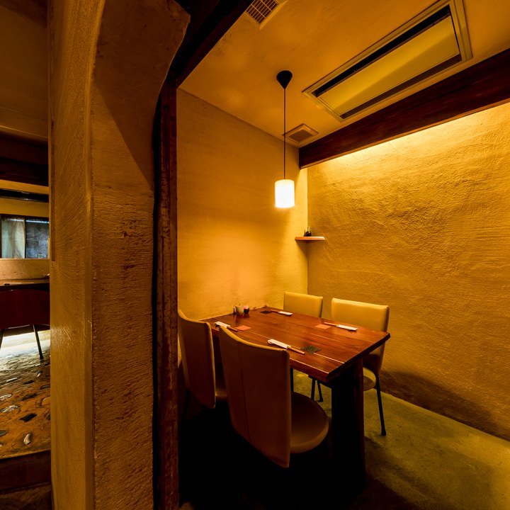 暖色系の温かみのあるライトが照らすテーブル席。4名様までご利用いただけるテーブル席を2卓ご用意。優しい雰囲気に包まれた居心地の良い空間は、ご接待やご商談、ご家族のお祝い事におすすめです。
